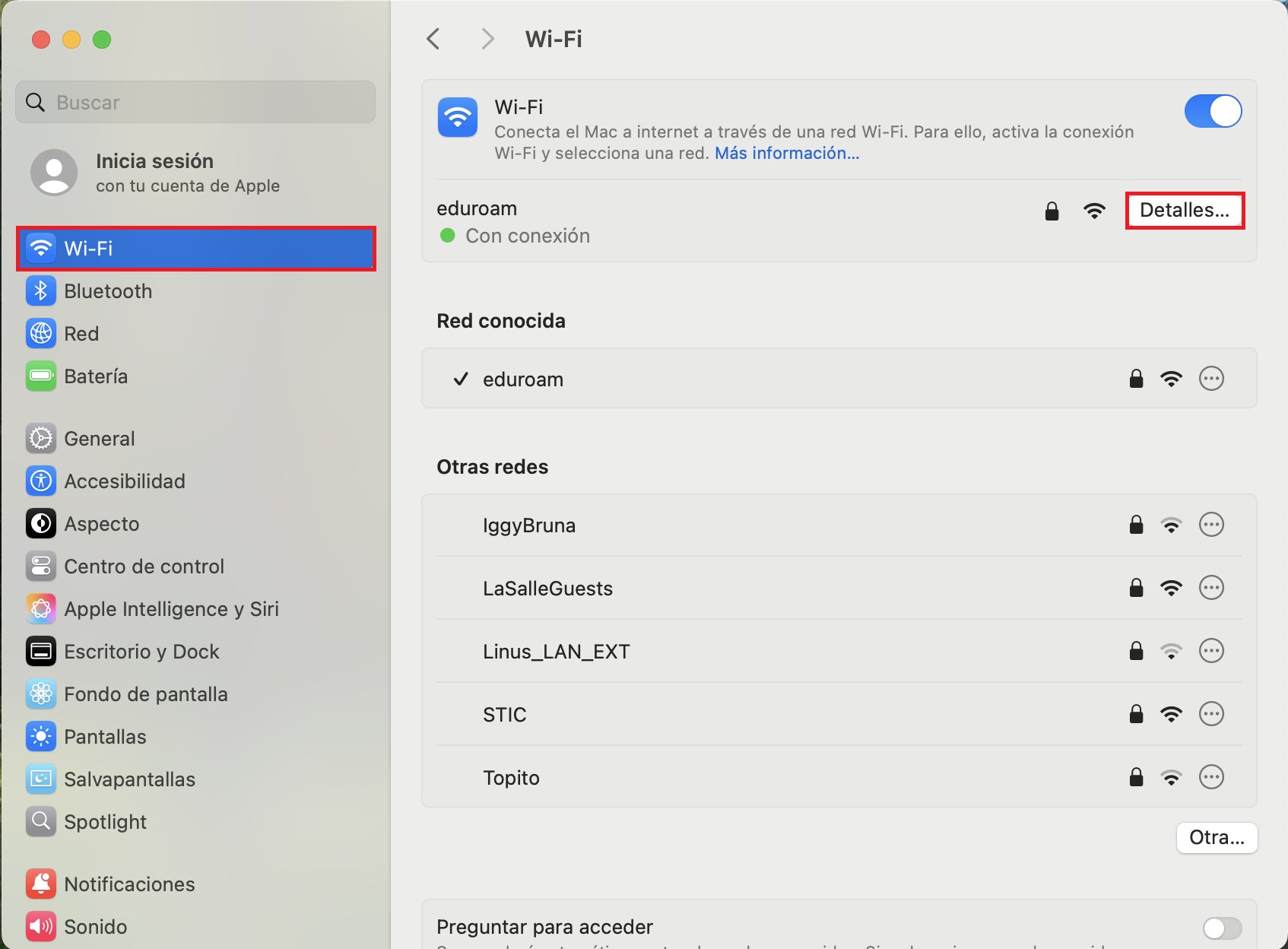 Un cop dins de la configuració de la teva xarxa, prem el botó Detalls... (sol estar a la part dreta, al costat de la xarxa connectada).