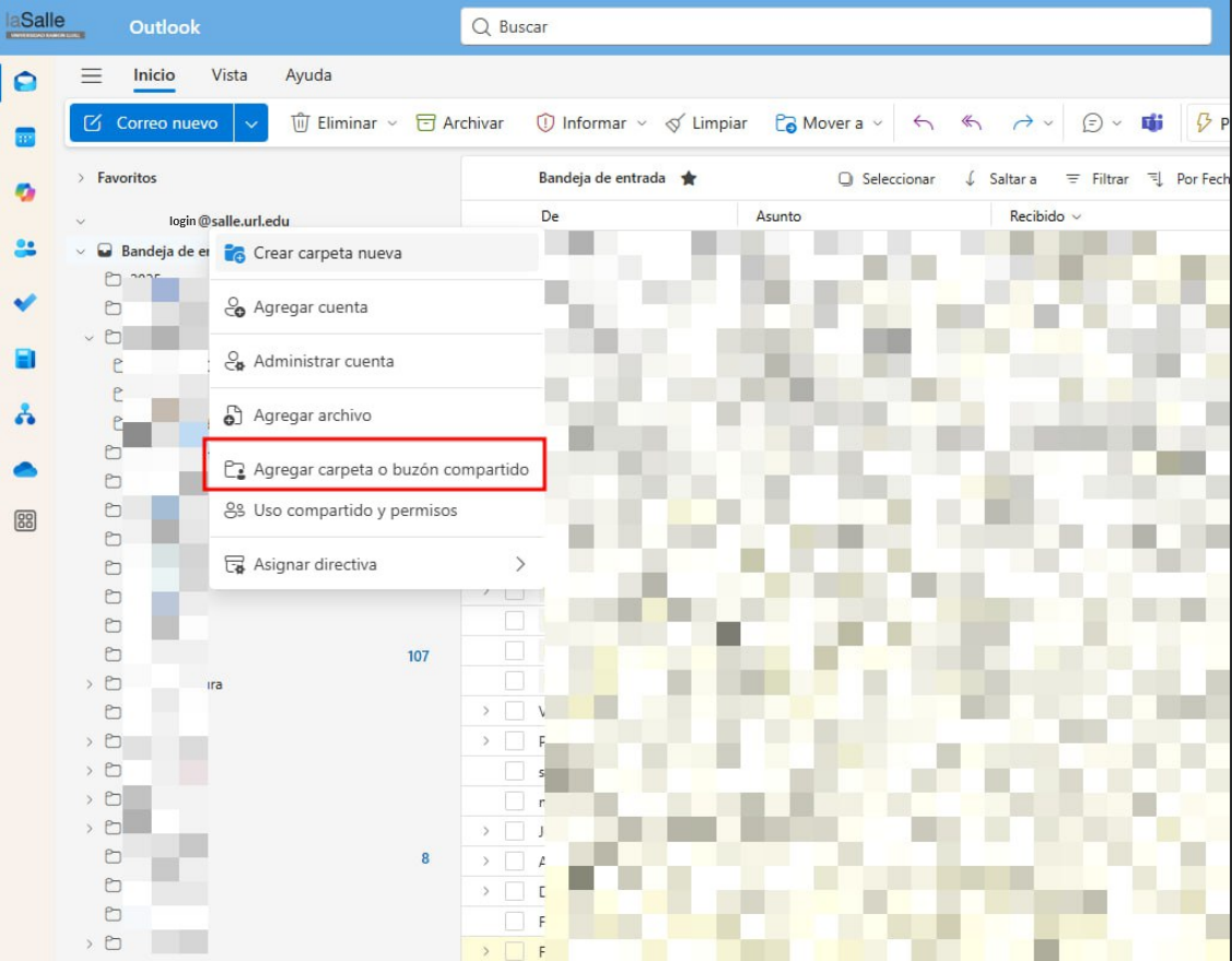 En aquest cas cal reobrir la bústia compartida de forma manual al nou Outlook. Per fer-ho, cal fer botó-dret al correu personal i seleccionar "obrir una bústia compartida".