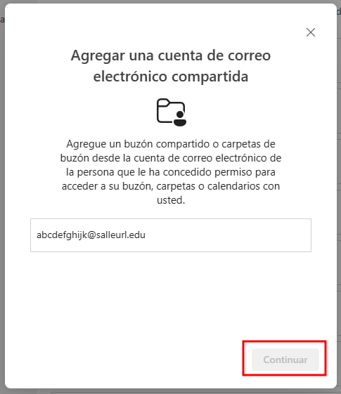 2. Apareixerà una finestra amb un requadre de text on heu d'escriure el correu de la bústia compartida. A continuació feu clic a Afegeix.